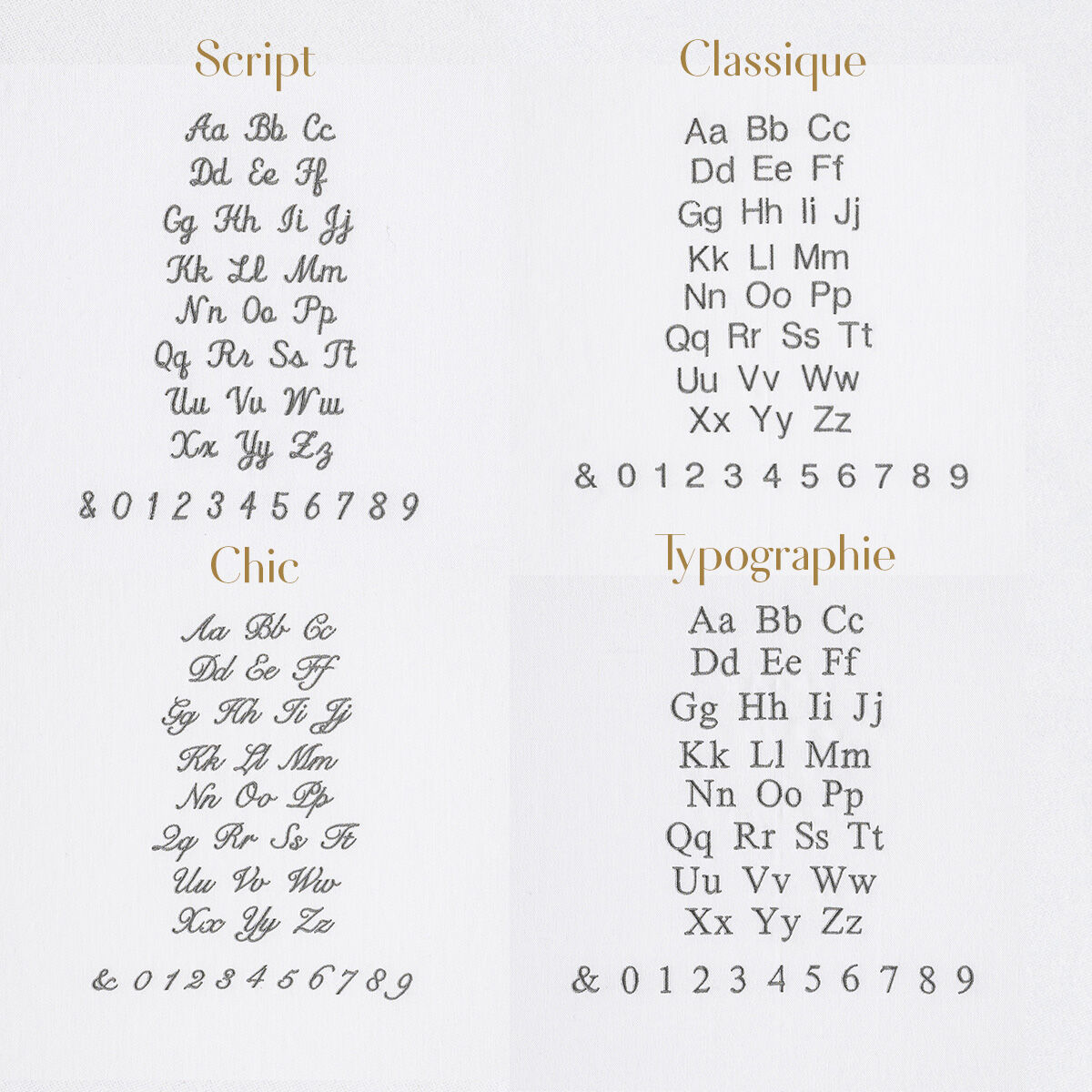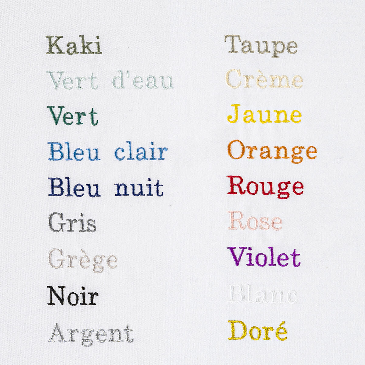 Pour rendre vos articles Le Jacquard Français uniques, vous pouvez faire broder un prénom ou un petit mot jusqu’à 15 caractères. Vous avez le choix entre quatre écritures et 18 coloris !